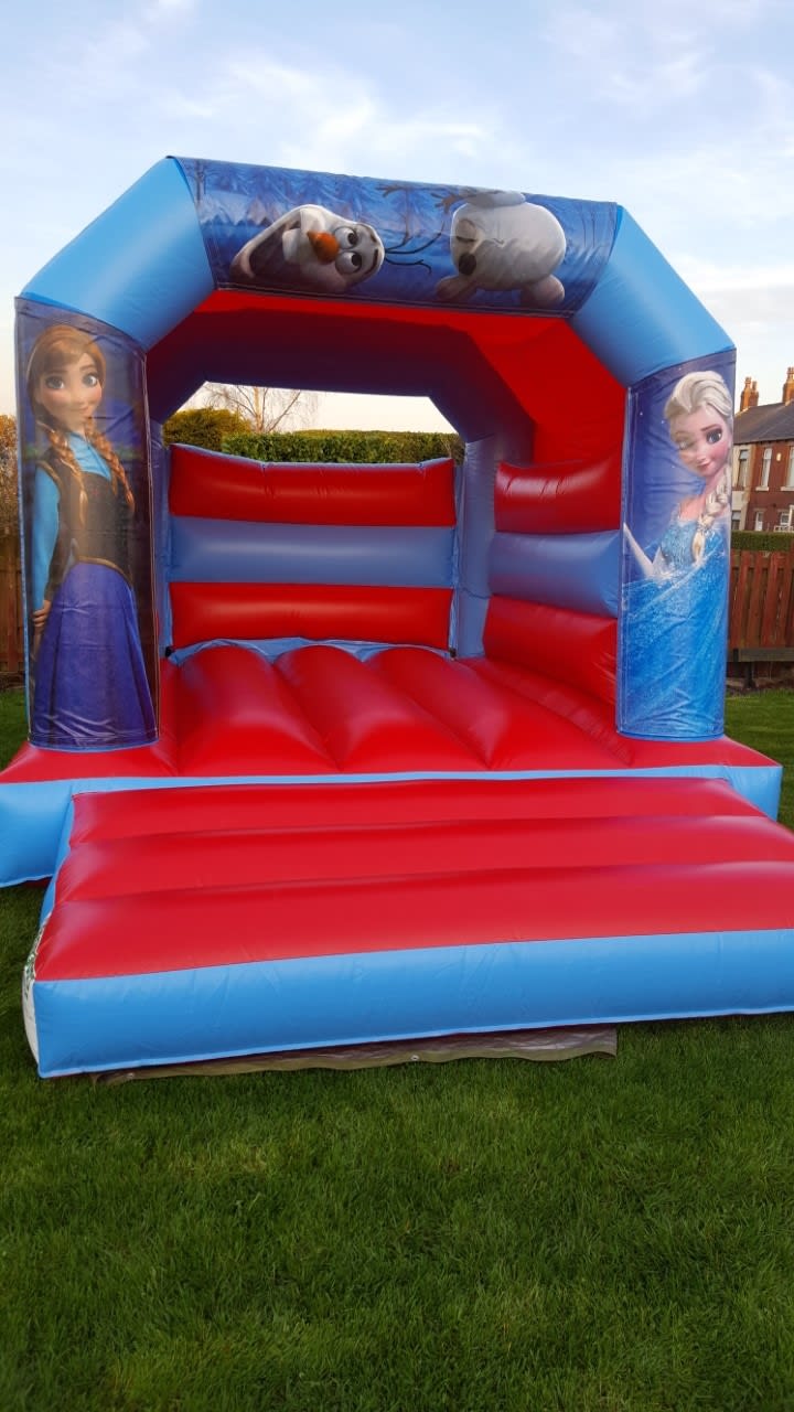 This Frozen Bouncy Castle is a new addition to our themed bouncy castle collection. Due to its low roof, it can be used as an indoor castle, as well as outdoors. This will fit in any indoor venue with a ceiling height no less than 9 foot 4 in height. Free delivery available for this unit throughout Huddersfield. A great choice for any children's fancy dress or princess party. If the castle is going indoors place check the celling height before booking, if you haven't checked the celling height and we arrive with the castle you will still have to pay for it as that is your responsibility. Please phone if you are unsure.